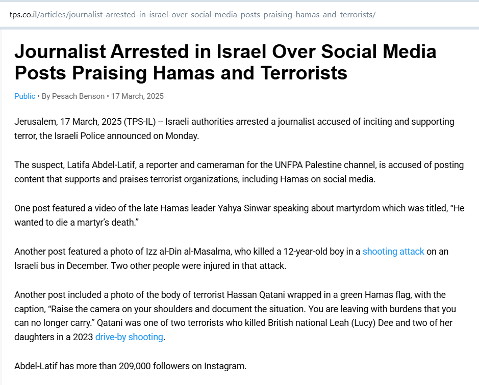 Incitement #21Journalist Arrested in Israel Over Social Media Posts Praising Hamas and Terrorists Public • By Pesach Benson • 17 March, 2025 Jerusalem, 17 March, 2025 (TPS-IL) -- Israeli authorities arrested a journalist accused of inciting and supporting terror, the Israeli Police announced on Monday. The suspect, Latifa Abdel-Latif, a reporter and cameraman for the UNFPA Palestine channel, is accused of posting content that supports and praises terrorist organizations, including Hamas on social media. One post featured a video of the late Hamas leader Yahya Sinwar speaking about martyrdom which was titled, “He wanted to die a martyr’s death.” Another post featured a photo of Izz al-Din al-Masalma, who killed a 12-year-old boy in a shooting attack on an Israeli bus in December. Two other people were injured in that attack. Another post included a photo of the body of terrorist Hassan Qatani wrapped in a green Hamas flag, with the caption, “Raise the camera on your shoulders and document the situation. You are leaving with burdens that you can no longer carry.” Qatani was one of two terrorists who killed British national Leah (Lucy) Dee and two of her daughters in a 2023 drive-by shooting. Abdel-Latif has more than 209,000 followers on Instagram.