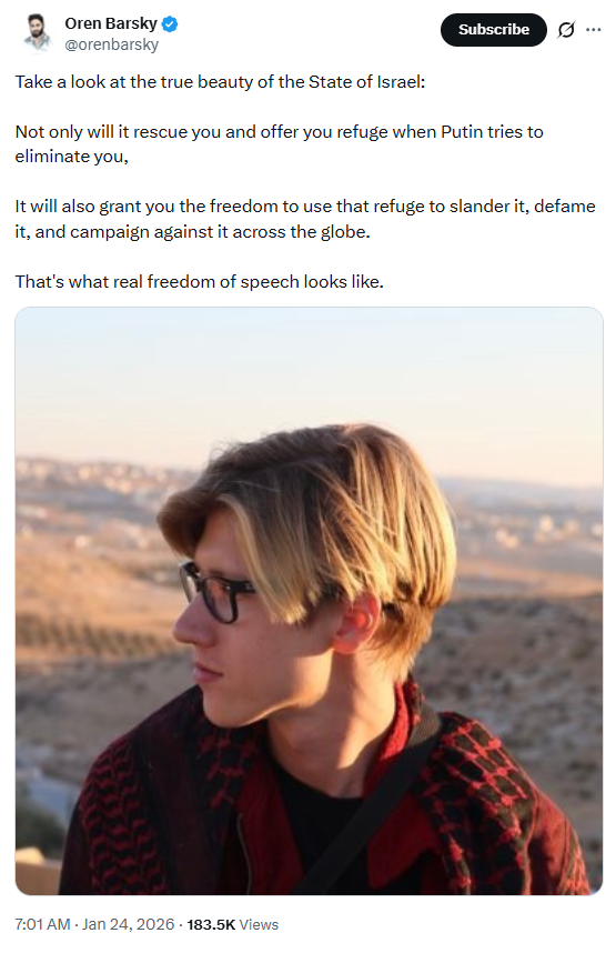 Incitement #100Take a look at the true beauty of the State of Israel: Not only will it rescue you and offer you refuge when Putin tries to eliminate you, It will also grant you the freedom to use that refuge to slander it, defame it, and campaign against it across the globe. That's what real freedom of speech looks like.