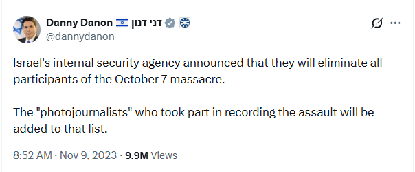 Israel's internal security agency announced that they will eliminate all participants of the October 7 massacre. The "photojournalists" who took part in recording the assault will be added to that list.