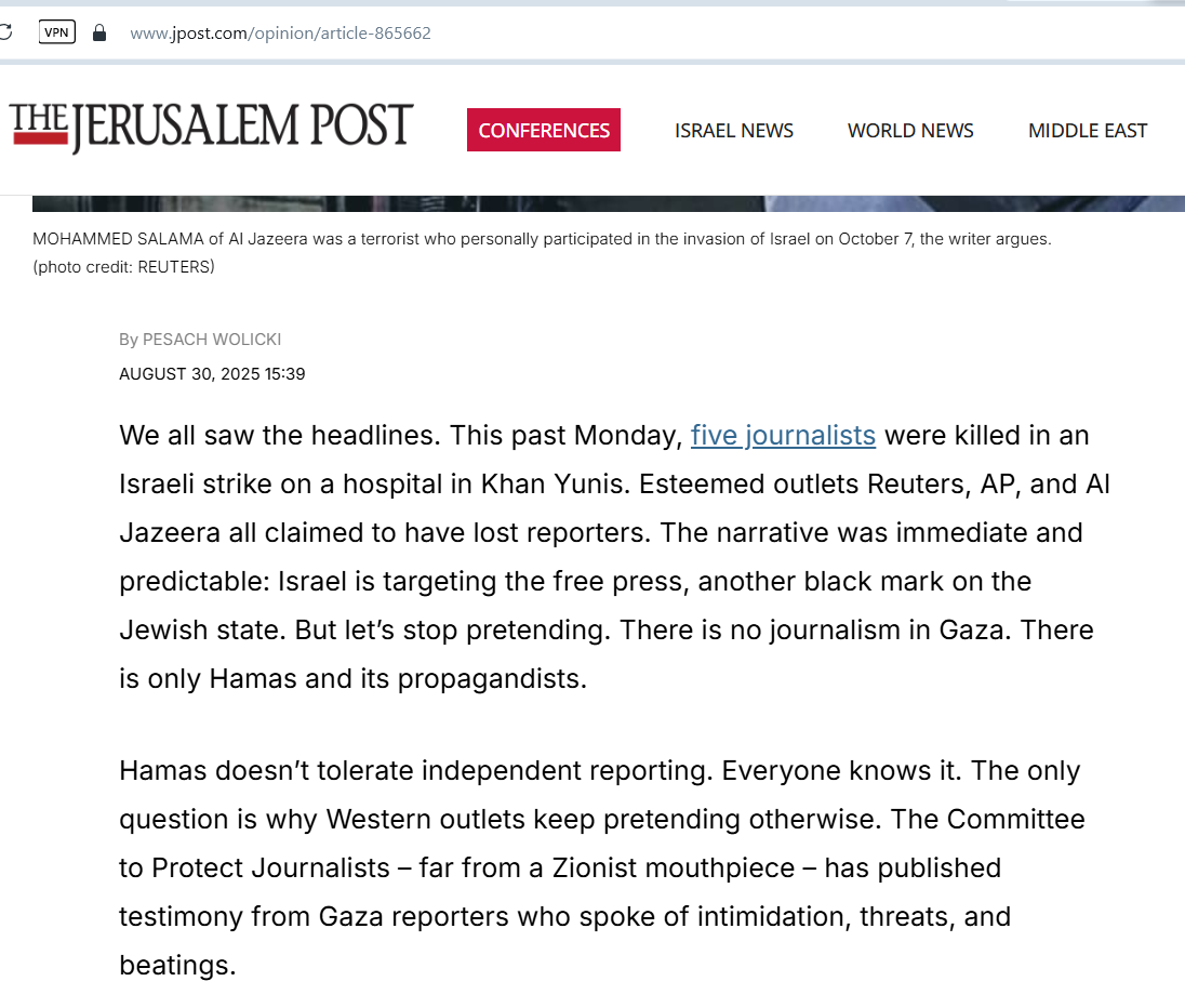 Incitement #74The “Free Press”—reportedly on the verge of being acquired by CBS and handed “the keys” to CBS News—released a video today describing Palestinian Al Jazeera journalists in Gaza as “an arm of Hamas” and justifying their systematic assassination by Israeli forces.